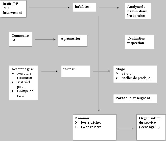 ) Un diagramme (non fourni) nous a alors été présenté résumant l'ensemble du système de formation de personnel en langue. Le voici dans les grandes lignes avec les erreurs de mémoire et de vue possibles. L'intitulé des cases est juste mais incomplet; les flèches un peu moins